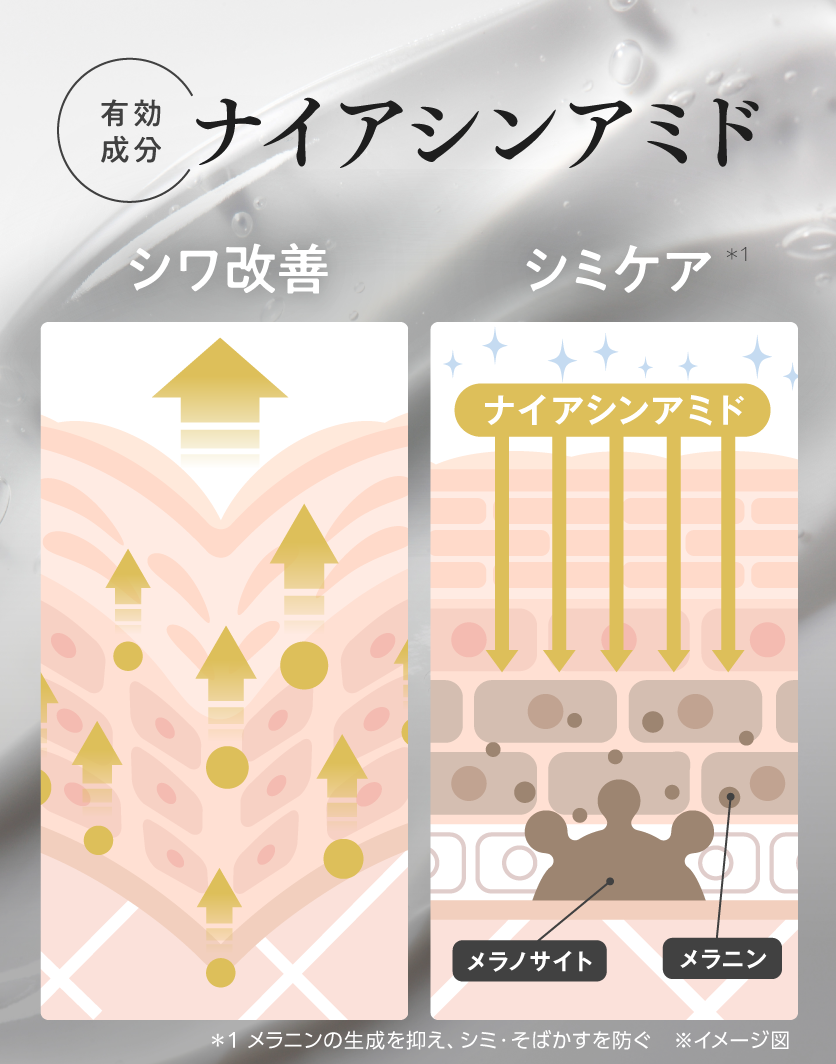 *1 シワ改善、メラニンの生成を抑え、シミ、そばかすを防ぐこと、*2 ナイアシンアミド(美白)、グリチルリチン酸ジカリウム(肌あれ防止)