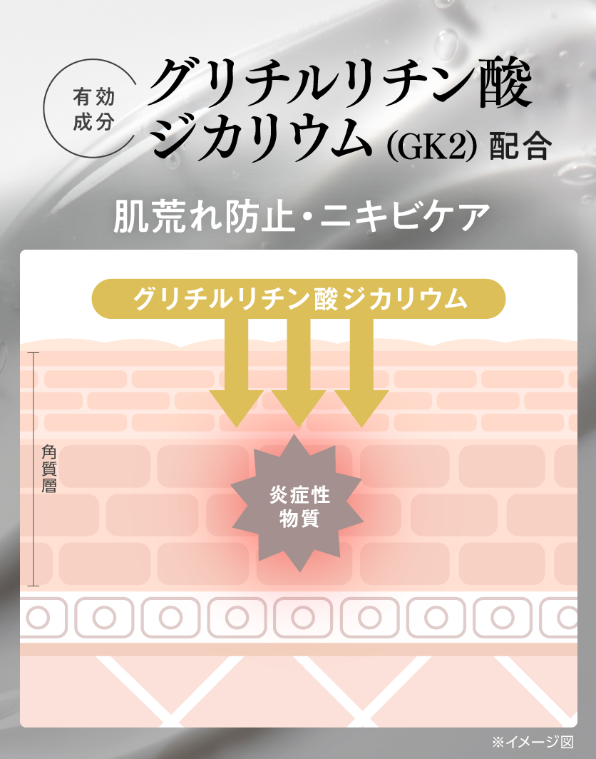 甘草から抽出された植物由来の薬用有効成分グリチルリチン酸ジカリウムを配合。肌を守り、カミソリ負け、肌あれ、ニキビを防ぎ、なめらかな肌へ導きます。