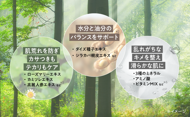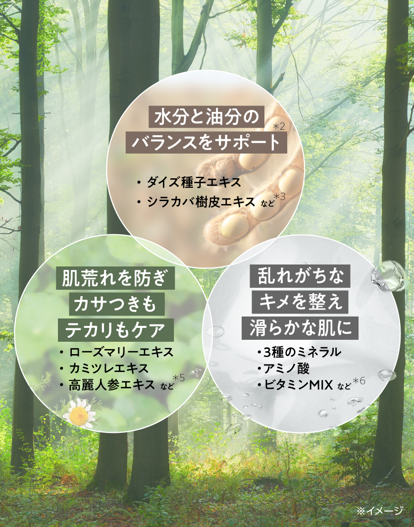 *2シラカバエキス、ダイズエキス、加水分解黒豆エキス、アセンヤクエキス、N-オクタノイルグリシン、ニンジンエキス、ローズマリーエキス、カモミラエキス(1)、チャエキス(1)、ツボクサエキス、カンゾウエキス、イタドリエキス、オウゴンエキス、L-アスパラギン酸マグネシウム、グルコン酸亜鉛、グルコン酸銅、タウリン、dl-α-トコフェロール2-L-アスコルビン酸リン酸ジエステルカリウム塩、無水カフェイン(整肌・保湿成分)