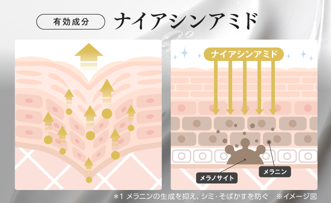 配合されている薬用成分ナイアシンアミドが真皮層でコラーゲン産生を促進することで、肌の奥から押し上げシワ改善作用に寄与します。また、メラニンの生成を抑えシミ・そばかすを防ぎます。